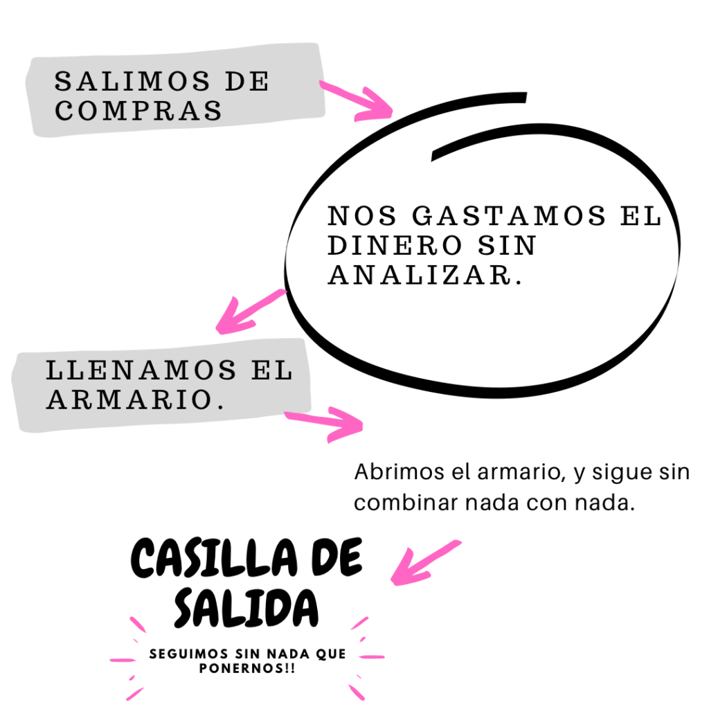 - El estrés y la ansiedad que nos entra al abrir el armario, ver que tenemos mucha ropa, pero «nada que ponernos», por qué? por que nada combina con nada, por que no nos parado a organizar y ver cuántos looks diferentes podemos hacer con cada prenda. Ya sabéis mínimo tres looks por prenda con la ropa que ya tenemos.